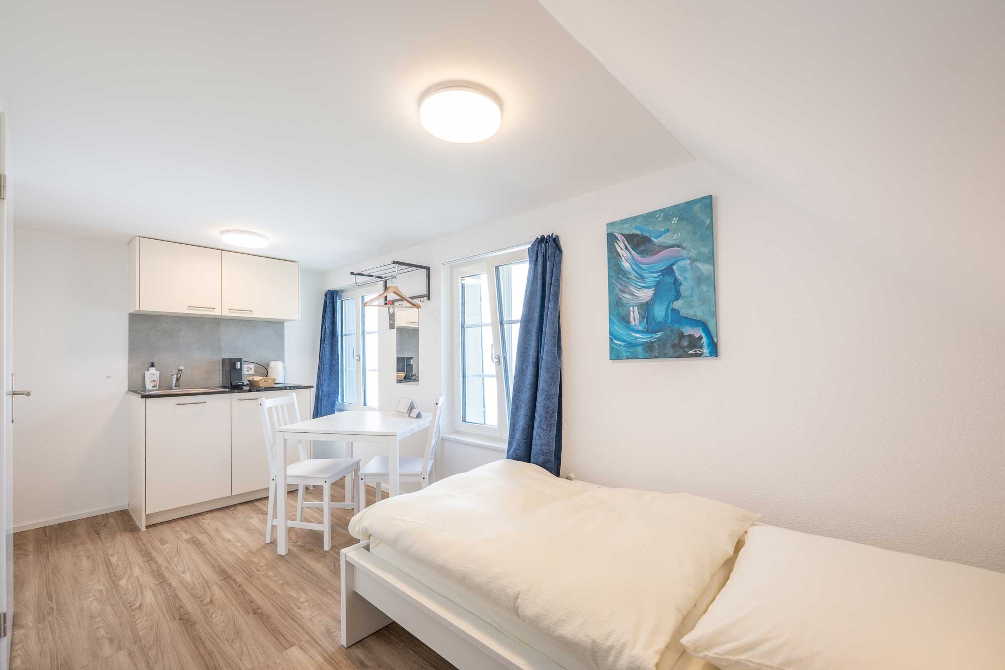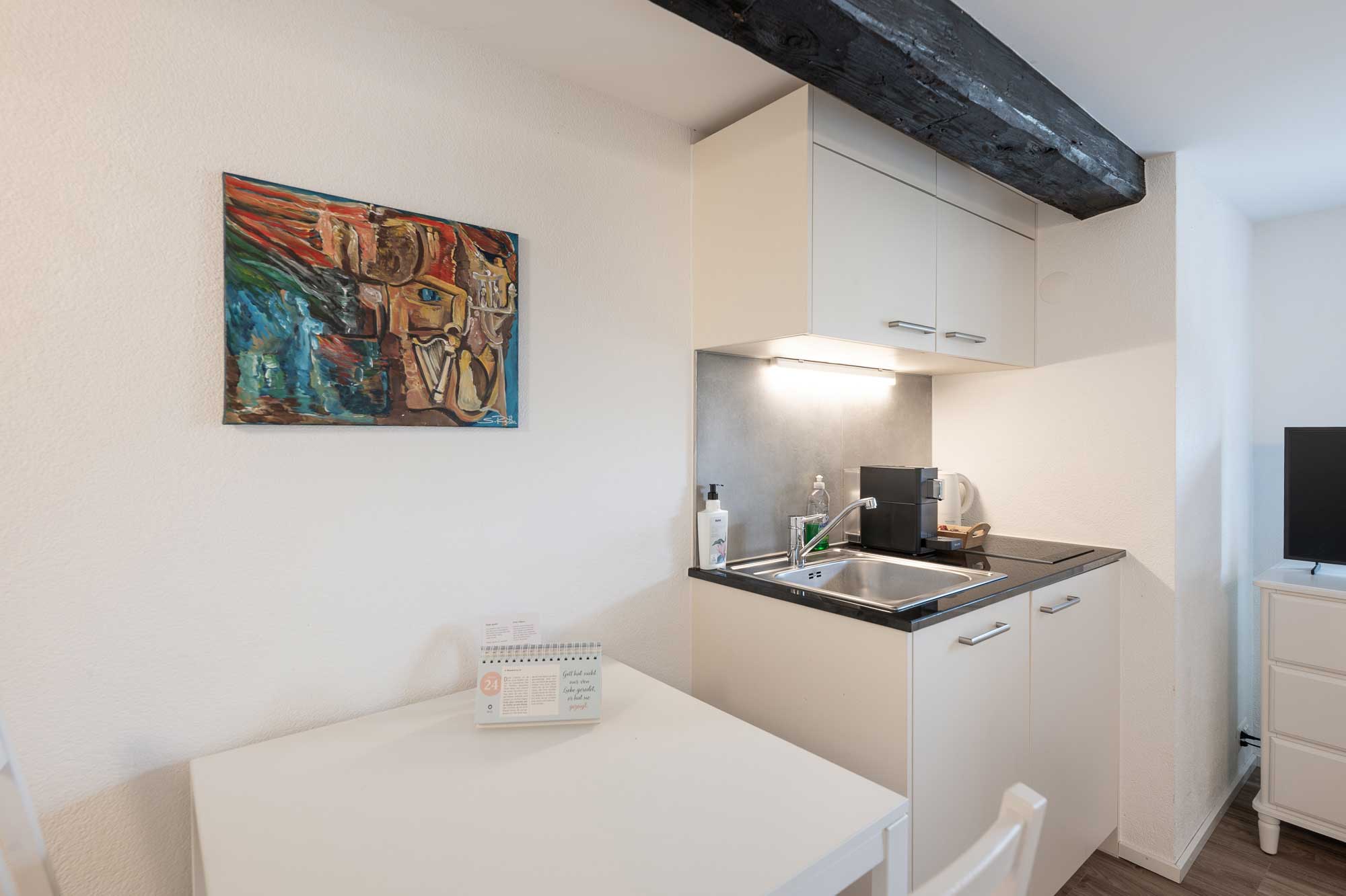 Die Studios sind stilvoll eingerichtet, mit WLAN sowie Kaffee- und Teekocher. Das Frühstück wird am Vorabend aufs Zimmer gebracht, bis das Café Mercy 2025 eröffnet wird.