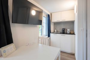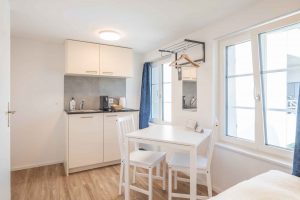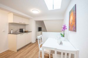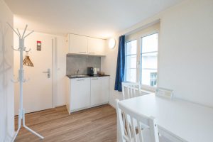 Die Studios sind stilvoll eingerichtet, mit WLAN sowie Kaffee- und Teekocher. Das Frühstück wird am Vorabend aufs Zimmer gebracht, bis das Café Mercy 2025 eröffnet wird.